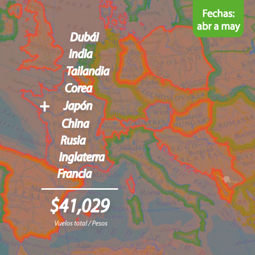 El orden de la ruta es CDMX > Inglaterra > Rusia > Emiratos > Tailandia > India > Corea > Japón > China > Francia > Inglaterra > CDMX