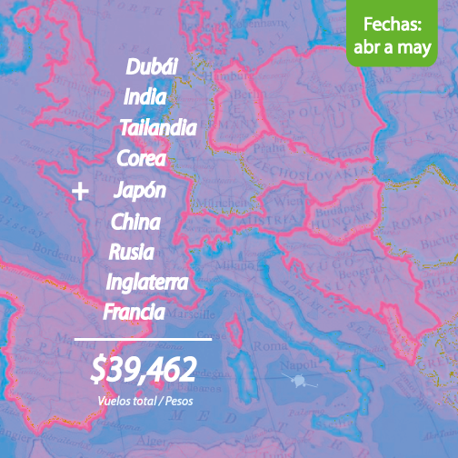 El orden de la ruta es CUN > Inglaterra > Rusia > Emiratos > Tailandia > India > Corea > Japón > China > Francia > Inglaterra > CUN