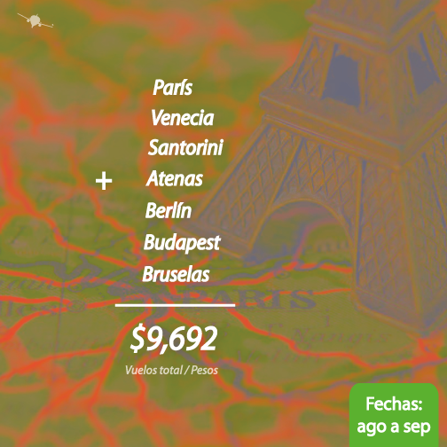 El orden de la ruta es Cancún > París > Venecia > Santorini > Atenas > Berlín > Budapest > Bruselas > París > Cancún