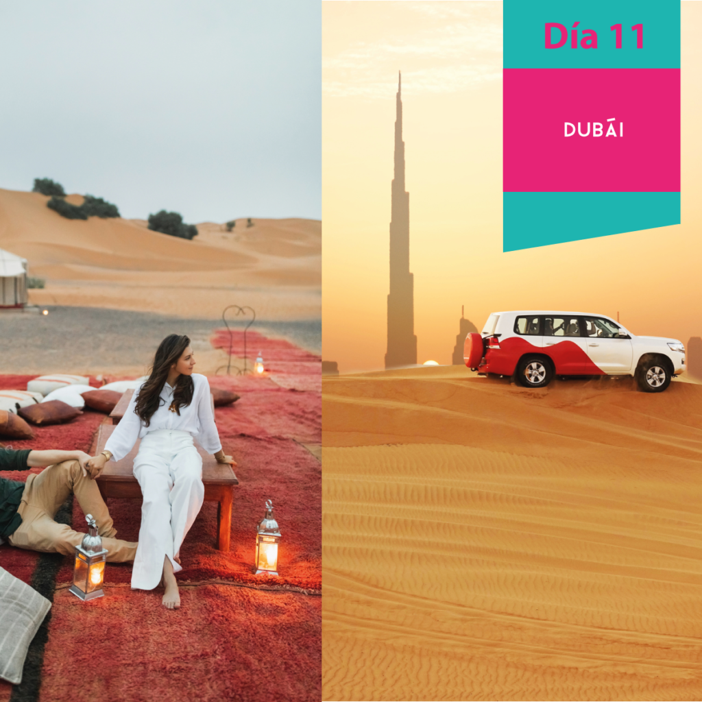 DIA 11. DUBAI Desayuno. Por la tarde visita opcional (con costo adicional) hacia el desierto para el “Safari Tour” con cena BBQ. Este tour en jeep 4×4 subiendo las dunas en el desierto, en el camino se para a ver los camellos y la maravillosa puesta del sol. Llegada al campamento con bienvenida tradicional árabe. Relajarse en las tiendas de los beduinos para adornar sus manos con la “henna”, hacer un breve paseo con el camello y tomar la “shisha”. Regreso al hotel. Alojamiento.