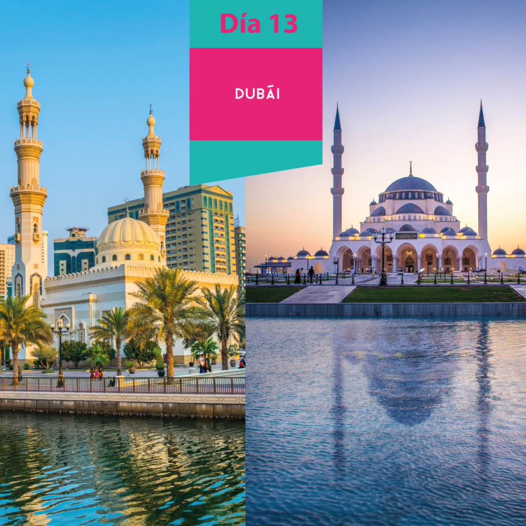 Desayuno. Día Libre. Posibilidad de realizar la visita opcional (con costo adicional) a Sharjah: el emirato de Sharjah está a solo 20 minutos del centro de Dubái, y se ha establecido como el centro cultural de Medio Oriente. Nuestro recorrido comienza en la Rotonda Monumental de la Cultura, antes de ir al Museo de la Civilización Islámica, después nos dirigiremos a la Corniche, con el Zoco de oro de Al Majara y en el corazón del distrito el patrimonio donde se encuentra la Cámara Al Naboodah y el zoco Al Arsa que dan una idea de cómo se vivía antiguamente. Seguimos en el zoco Central, con su típica arquitectura árabe. Terminamos con la visita del acuario de Sharjah que es muy interesante para conocer la vida marítima de las costas de Sharjah y luego. Regreso a Dubái. Alojamiento.