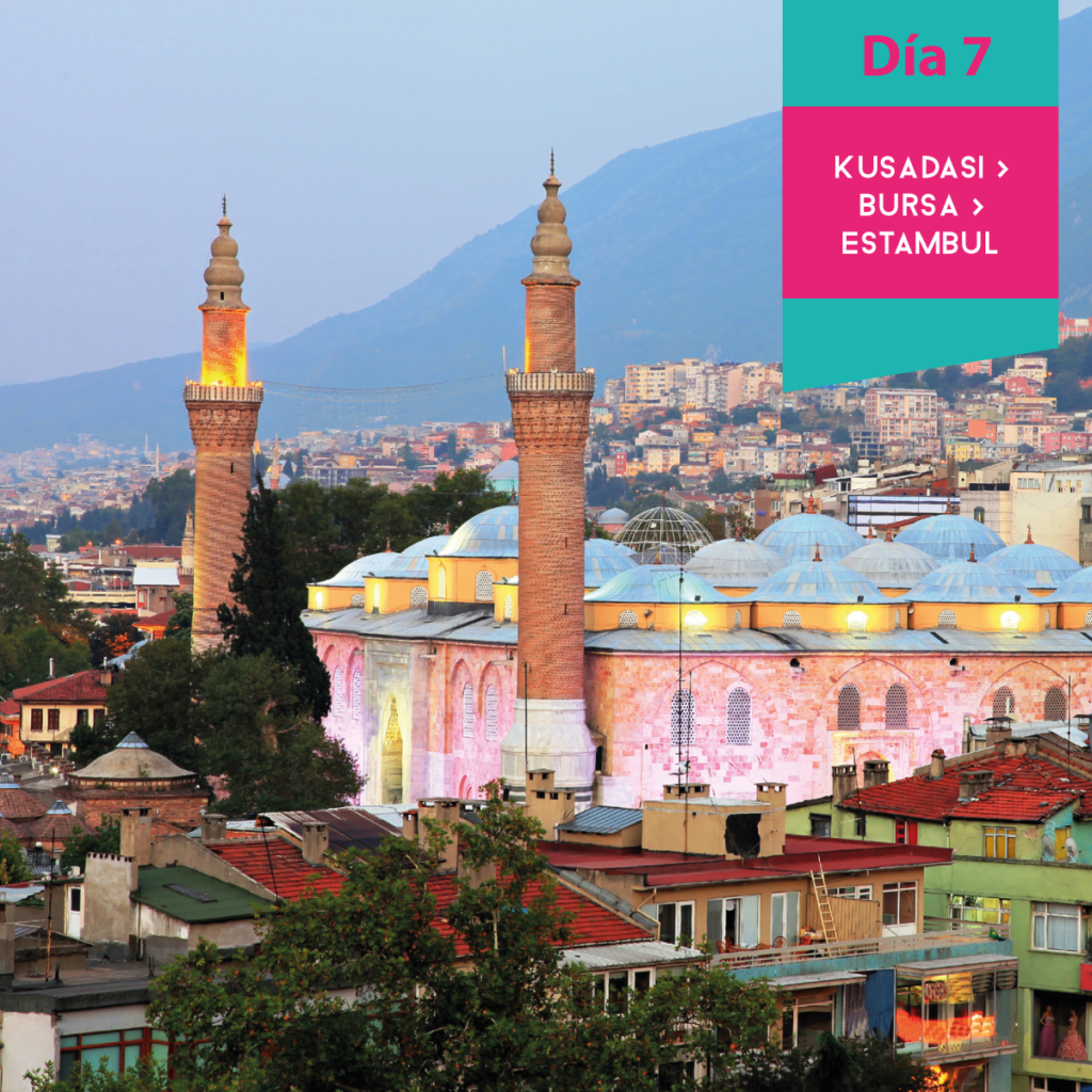 Desayuno. Desayuno. Salida hacia Bursa. Visita panorámica de esta importante ciudad que fue la primera capital del Imperio Otomano. Visita de la Mezquita Ulu Camii, la mezquita principal de la ciudad y una de las más bellas de toda Turquía. También tendrán la oportunidad de dar un paseo por el mercado de la seda, donde podrá apreciar antigüedades, sedas, perfumes y pashminas. Alojamiento.